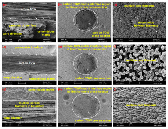 Table 3 illustrates the panel density, fiber volume fractions (wt.%), void content, and water absorption results of the control (CC) and carbon fiber concretes (C-1D, C-2D, and C-4D). SEM micrographs of the multiaxis 3D concrete composites before the flexural test are exhibited in Figure 5a–i. As depicted in Table 3 and Figure 5, the total fiber content of all samples are between 2.48 and 2.56 wt.%. Additionally, all samples’ average density and void contents were 2.20 and 19.02%, respectively. The outside surrounding of the carbon fiber TOWs in the concrete structures was almost perfectly bonded in the C-1D (Figure 5a,b), C-2D (Figure 5d,e), and C-4D (Figure 5g,h) concretes. Thus, almost defect-free multiaxis 3D carbon concrete composite samples were made for the flexural test.