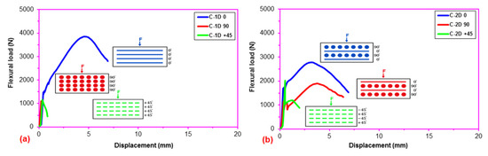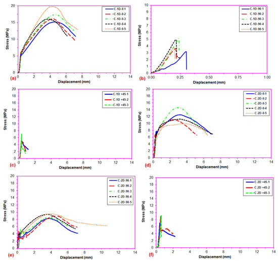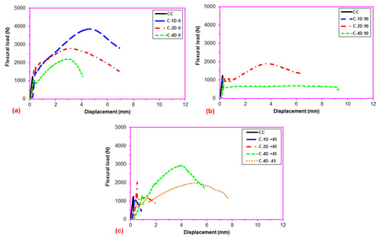 In Figure 7a–f, the flexural stress-displacement curves of the C-1D-(0°) composite was higher than that of C-1D-(90°), C-1D-(+45°) and C-2D-(0°), C-2D-(90°) and C-2D-(+45°) due to the 0° fiber orientation and amount of partial fiber weight fraction in the axial fiber (0° fiber) direction. However, the flexural stress-displacement curves of C-1D-(90°), C-1D-(+45°), and C-2D-(+45°) showed similar curves compared to the control concrete.