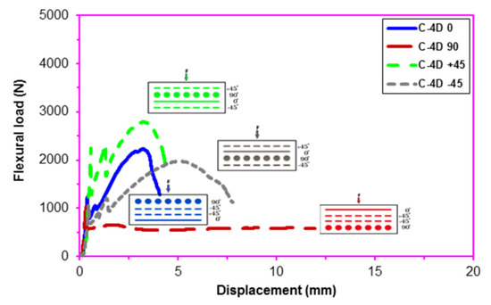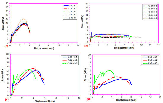 In Figure 8a–d, the flexural stress-displacement curves of C-4D-(0°) exhibited similar behavior compared to C-4D-(±45°) except C-4D-(90°) in which it showed a slight strain hardening stage and more ductile material behavior. Material properties in the carbon fiber C-4D concrete were homogeneously distributed via multiaxis fiber orientation throughout the concrete structure.