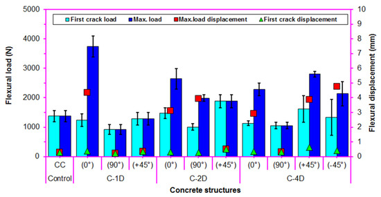 The average maximum flexural load, first crack load, maximum load displacement, and first crack displacement for the developed multiaxis 3D carbon concrete composites are shown in Figure 11. As illustrated in Figure 11 and Table 4, the maximum flexural load of the pristine concrete was 1374.93 N. The off-axis flexural maximum load of the carbon fiber concretes ranged from 920.16 to 3745.68 N for C-1D, from 1881.50 to 2644.95 N for C-2D, and from 1052.87 to 2799.47 N for C-4D. In addition, It was identified that standard deviations of the flexural maximum strength of all concrete structures were obtained between 0.43 and 1.84 (MPa), which was insignificantly small.