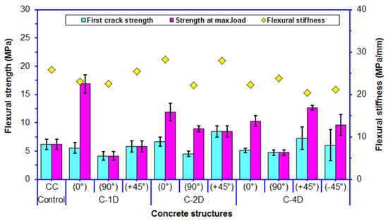 Average flexural maximum strength, first crack strength, and initial stiffness for the developed multiaxis 3D carbon concrete composites are shown in Figure 12. As depicted in Figure 12 and Table 4, the average panel maximum strength of the control (CC) concrete was 6.19 MPa. The off-axis flexural maximum strength of the carbon fiber concretes ranged from 5.81 to 16.87 MPa for C-1D, from 8.47 to 11.91 MPa for C-2D, and from 4.74 to 12.61 MPa for C-4D concrete structure.