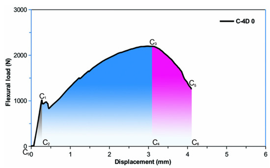 As depicted in a general characterization of the load-displacement curves of C-1D, C-2D, and C-4D PAN carbon TOW concretes (Figure 9 and Figure 10), the fiber orientation influenced the flexural load-displacement curves of the sample considerably. When the 0° fiber changed its positions from the bottom (C-4D-(0°)) to the top of the concrete structure (C-4D-(90°)), the flexural load-displacement curves were shifted from strain hardening to the strain-softening (ductile) material stages. This was identified as a critical finding in the developed multiaxis 3D PAN carbon fiber concrete composites.