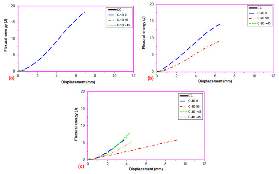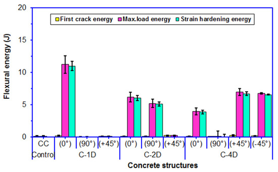 As illustrated in Figure 14a–c, the energy deflection curves steeply inclined in the order from neat concrete (CC) to multiaxis fiber (C-4D, C-2D, and C-1D) concretes, partly due to the strain hardening behavior of the carbon fibers in the concretes and partly carbon fiber properties. The C-1D-(0°), C-2D-(0°), and C-4D-(0° and 90° and ±45°) structures demonstrated outstandingly better energy absorption performance with regards to the C-1D-(90° and +45°), C-2D-(+45°) and CC structures probably due to the strain hardening energy absorption stage and fiber orientation. It was observed that C-1D-(90° and +45°), C-2D-(+45°), and C-4D-(90°) had an insignificant strain hardening stage (Figure 6b,c). The off-axis fiber energy absorption in C-4D was significant considering the C-2D and C-1D structures due to the multiaxis fiber placement and homogeneous fiber distribution throughout the in-plane of the concrete structure.