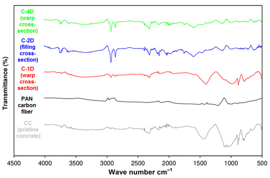 In the FTIR spectrum of the pristine concrete (CC), as demonstrated in Figure 16, the main compound detected in the CC was calcium carbonate, supported by several strong bands. Meanwhile, 1423 cm−1 was assigned to the C–O stretching vibration. Concerning the other parts of the spectrum, the band at 1083 cm−1 may be attributed to Si-O asymmetric stretching vibrations [93]. The bands at 868 and 771 cm−1 can be attributed to the -C-C-, -C-H- groups [94,95,96]. The peak extending between 3500 and 3000 cm−1 was the absorption peak of the Si-OH and –OH groups. In the FTIR spectrum of the PAN carbon fiber (C), as illustrated in Figure 16, the peaks at 3022 and 2952 cm−1 were the deformation vibrations of the -CH2-CH- (aliphatic) groups, whereas the peak at 2336 cm−1 was ascribed to the deformation vibrations of the functional group of −C≡N (nitryl) [97]. The peaks at 1432 cm−1 and 1356 cm−1 were attributed to the stretching vibrations of the -C=N- group. In addition, the peaks observed between 1194 and 885 cm−1 corresponded to -C-C- and -C-N- bonds [98]. In the FTIR spectrum of the C1-D (warp cross-section), C-2D (filling cross-section), and C-4D (warp cross-section) PAN carbon/cementitious concrete composites (Figure 16), a common signal on all developed structures were detected. The peak observed between 3500 and 3000 cm−1 bands may be attributed to the deformation vibrations of H2O, polycarboxylate, -Si-OH, and -Ca-OH groups. In the 3000–2850 cm−1 band spacing, the deformation vibrations of -CH2-CH- (aliphatic) groups were observed, whereas the signal between 2300 and 2200 cm−1 corresponded to the −C≡N (nitryl) group. The signals between 1600 and 1300 cm−1 were attributed to stretching vibrations of the -C=C-, -C=O, and -C=N groups. The signal observed between 1100 and 1000 cm−1 was assigned to Si-O asymmetric stretching vibrations, and another signal in the 900–500 cm−1 band spacing was considered the stretching vibrations of single bond groups.