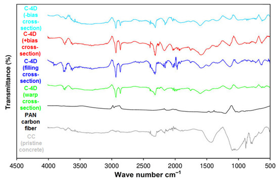 The Fourier transform infra-red (FTIR) spectra of the CC (pristine concrete), PAN-based carbon fiber, C-1D, C-2D, and C-4D carbon fiber reinforced concretes are shown in Figure 16. In addition, the FTIR spectra of the CC (pristine concrete), PAN-based carbon fiber, and four C-4D carbon fiber concrete composites such as C-4D warp cross-section, C-4D filling cross-section, C-4D +bias cross-section, and C-4D-bias cross-sectional samples are exhibited in Figure 17.