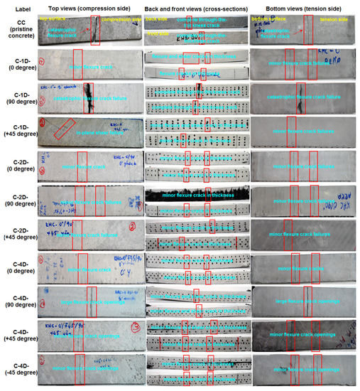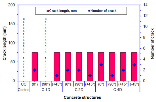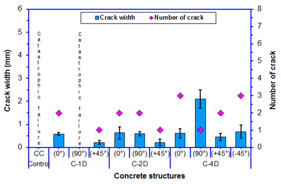 Table 6 outlines the flexural failure results. The length and number of cracks in the fractured samples are exhibited in Figure 18. Further, the width and number of cracks in fractured multiaxis 3D fiber concrete are shown in Figure 19. As shown in Table 6 and Figure 18 and Figure 19, the pristine concrete exhibited catastrophic failure under the four-point flexural load. The off-axis flexural crack width of the carbon fiber concretes ranged from 0.217 to 0.585 mm for C-1D, from 0.216 to 0.630 mm for C-2D, and from 0.461 to 2.102 mm for C-4D. The crack distances in C-1D-(0°), C-2D-(0°), and C-2D-(90°) were 103.80, 88.60, and 68.90 mm, respectively. However, the crack distance ranged from 52.40 to 68.10 mm for C-4D-(0°), from 37.30 to 73.90 mm for C-4D-(+45°), and from 53.30 to 78.10 mm for C-4D-(−45°).