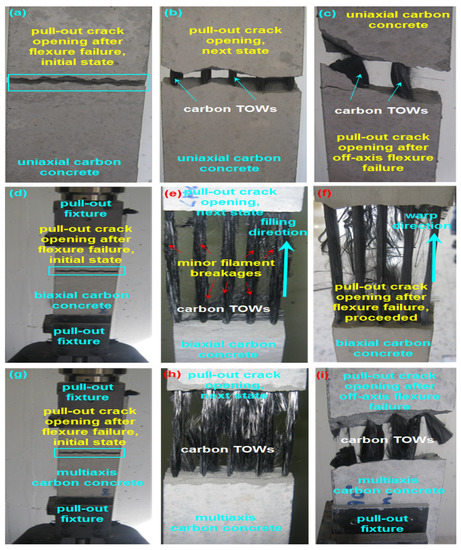 Numerous research studies have been carried out on concrete with added staple fiber or fabric substrate. However, limited research on the mechanical properties of the 3D concrete structure was examined considering a dry, continuous, filamentous TOW-based layered architecture with large meshes. Thus, the research aimed to develop multiaxially oriented high-strength and high modulus continuous carbon fiber-based concrete composite and to search experimentally the principal and angular (off-axis) flexural properties of these concrete composites.