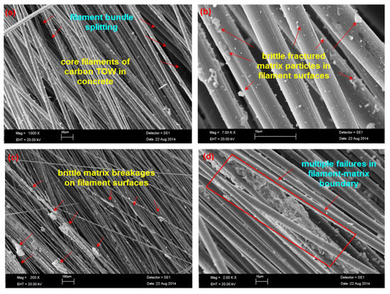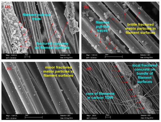 In the case of textile reinforced mortar (TRM) jackets, the U-wrapping strengthening configuration is much more effective than the side-bonding configuration, and increasing the number of layers significantly increases the effectiveness of the TRM jacket [51]. Another study reported that near-surface positioned U-jacketed carbon fabric concrete improved the mode-I delamination failure compared to the neat concrete [52]. It was demonstrated that anchoring the carbon fabric/epoxy composite to the concrete surface improved its ductility and crack arresting mechanism compared to the adhesively joint structures [53]. Concrete surface bonded carbon fabric composite externally bonded to the concrete with cement-based adhesive showed better flexural strengthening properties compared to the epoxy adhesive [54]. Carbon fabric composite was used as a stirrup element in concrete structures to enhance the shear properties. Furthermore, it was found that failure mode depended on the shear span/depth ratio and illustrated diagonal cracks [55]. The fracture toughness of staple high strength and modulus fiber reinforced concrete increased due to complex fiber-cement crack opening resistance and crack propagations [56]. The prevailing failures of short carbon fiber added reinforced concrete were fiber slippage and tensile fiber breakages in the cementitious matrix [57]. It was illustrated that the mechanical performances of impregnated carbon fiber concrete at elevated temperatures were improved due to using reactive mineral suspensions on the carbon fiber surface [58]. It was found that surface-functionalized staple carbon fiber demonstrated homogeneous dispersion and strong bonding in the cementitious matrix [59]. It was illustrated that tensile strength and modulus of polypropylene/cement concrete were raised due to the addition of nanoclays. Furthermore, the electromagnetic interference (EMI) shielding effectiveness and mechanical properties of concrete were improved with the incorporation of carbon nanotubes (0–2.0 wt.%), probably due to the denser calcium silicate hydrate (or C-S-H) structure, as well as nano bridging and pore-filling [60,61]. The porosity of ultra-high-strength concrete was reduced by about 30% by adding carbon nanofibers (CNFs, 0.3%), which influenced the internal morphology [62]. Further, it was reported that the addition of carbon nanofibers and foam steel/cementitious lightweight concrete have comparable mechanical and bond strength with ordinary steel concrete [63].