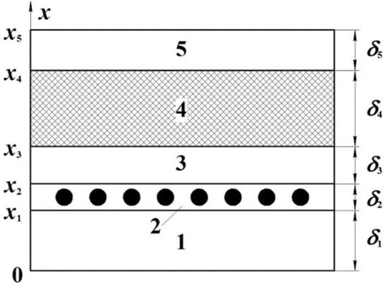 a; the shaping surface was made of the composite. The system under study consisted of five layers: the lower layer of the thermal fixture, the resistive layer with internal heat sources, the upper layer of the thermal fixture, the moulded package of polymeric composite material, and the auxiliary layer (