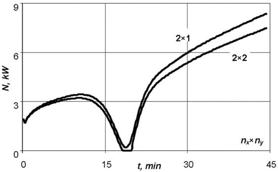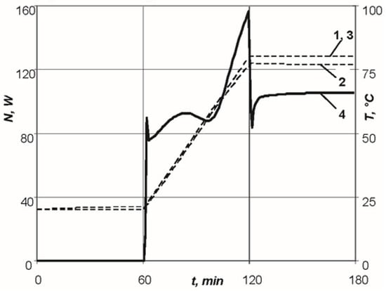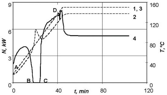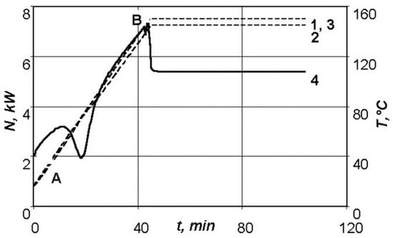 Figure 6 shows the temperature–time relationship on the outer surfaces of the moulded product for a similar thermodynamic system, when the thickness of the moulded package is 5 mm, as well as the dependence of the required power of the heating system on time. In this case, the power of the resistive layer drops to zero at point B, which is explained by the growing exothermic effect of the curing reaction with the increase in thickness of the moulded package.