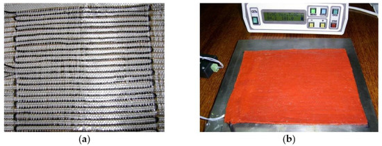 Figure 14) was formed on the basis of four resistive blocks connected in parallel, which were laid in two. The resistive structure was drawn through the layer of fiberglass in serpentine rows of 6 mm pitch, with two strands in a hemstitch. High-temperature silicone was used as a nonconductive layer, deposited on both sides of the fiberglass with an extended resistive structure. The thickness of the thermal blanket was 6 mm, which ensured a uniform temperature distribution over the surface. The power of the heating system (220 W) was sufficient for moulding of patches of 2−4 mm thick.