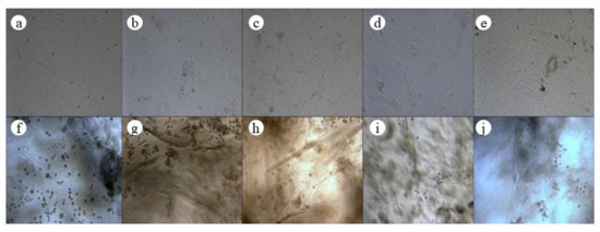 The microscopic photos of ADSCs at different times are shown in Figure 4, in which a–e are the microscopic photos of the cells in the jawbones scaffold group at 0 d, 5 d, 7 d, 10 d, and 14 d, and f–j were the microscopic photos of the cells in the control group at 0 d, 5 d, 7 d, 10 d, and 14 d. It could be seen that the morphology of the cells in the jawbones scaffold group was similar to that of the control group at different times of bone induction.