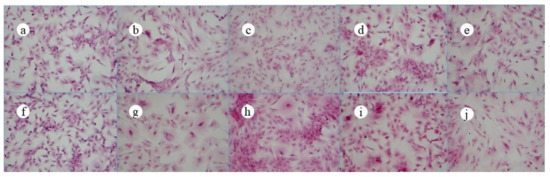 Figure 5 shows the HE staining photos of ADSCs at different times, in which a–e are the HE staining photos of the cells in the jawbones scaffold group at 0 d, 5 d, 7 d, 10 d, and 14 d, and f–j are the HE staining photos of the cells in the control group at 0 d, 5 d, 7 d, 10 d, and 14 d. As shown in Figure 3, the morphology of the cells in the jawbones scaffold group was roughly the same as that of the control group at different times of bone induction.