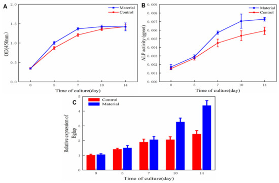 Cell proliferation rate (A), cell ALP activity (B), and relative mRNA expression level of cell osteocalcin (C) of the scaffold treated group and control group.