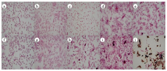 Figure 7 shows the staining images of cellular Von Kossa mineralized nodules in bone induction at different times, in which a–e are the images of the control group at 0 d, 5 d, 7 d, 10 d, and 14 d, and f–j are the images of the jawbones scaffold group at 0 d, 5 d, 7 d, 10 d, and 14 d. A small number of black sedimentary nodules were observed on the jawbones scaffold 10 d after bone induction; its color deepened and the amount increased significantly in 14 d after bone induction. It implied that a large amount of calcium-like matrix had been produced and mineralized, and the jawbones scaffold significantly stimulated the formation of cellular mineralized nodules.