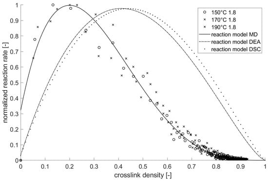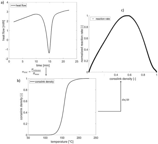 The thermally stimulated depolarization currents method [,] and DSC are applicable for an experimental determination of the activation energy, while the DSC method has been employed in our study. Concerning the results of DSC measurements, the activation energy EA and the pre-exponential A could be determined using the Kissinger method []. For predicting the unknown parameter in reaction model f(α), the following procedure is performed. During the curing process, the change of heat flow in dependency of time and temperature is detected by DSC shown in Figure 2a. According to the resultant change of heat amount, temperature- and time-dependent crosslink density is a ratio of the released heat amount Hrelease to the maximum heat amount Hmax in a fully crosslinked state, using Equation (4) (see Figure 2b). Figure 2c shows the reaction rate in dependency on the crosslinking degree to estimate the unknown parameter in the reaction model f(α):