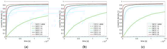 Curves of crosslink density depending on curing time concerning the influences of cutoff distances (1.48 Å→2.5 Å) at (a) 150 °C, (b) 170 °C, and (c) 190 °C.