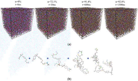 Changes in molecular structures during the curing process with the cutoff distance of 1.8 Å at 190 °C: (a) total view of the simulation box with periodic boundary, and (b) growth of the molecule as an example.