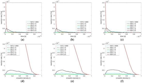 (a–c) Curves of reaction rate depending on curing time and (d–f) curves of reaction rate depending on crosslink density concerning the influence of cutoff distance (1.48 Å→2.5 Å) at 150 °C, 170 °C, and 190 °C.
