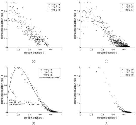 Concerning the difference in the time scale between the molecular dynamics simulation in the nanoseconds range and the experimental study in the seconds range, the evaluation procedure for determining the reaction model f(α) regarding the experimental results can also be applied for the calculation based on the simulation results. As shown in Figure 6a–c, the time dependent reaction rate is calculated based on crosslink density depending on curing time, which is simulated using various cutoff distances and temperatures in Figure 3. With a large cutoff (2.5 Å), the maximal reaction rate is achieved immediately after the beginning of curing. As the cutoff distance decreases, the maximal reaction rate decreases until no reaction occurs during the simulation time. The data of reaction rate and the associated crosslink density at the same curing time are transferred to Figure 6d–f to further explain the determination of the unknown parameters in reaction model f(α). After that, the reaction rate curve is normalized according to the maximum reaction rate, related to the associated cutoff distance and temperature. Since the temperature dependency is considered by factor k(T) in Equation (7), the data (normalized dα/dt vs. α), simulated with the same cutoff distance at different temperatures, are merged for the subsequent regression procedure (see Figure 7).
