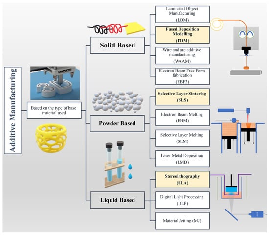 Classification of AM techniques based on the type of base materials used and the scope of the current review as highlighted (FDM, SLS, and SLA). The 3D printing image is taken from [72].