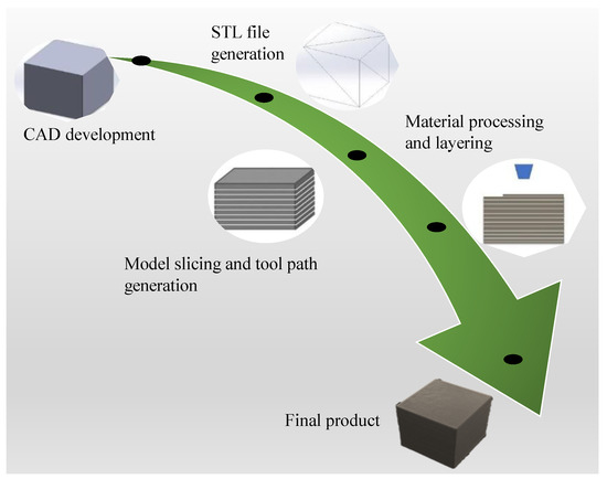 The fundamental process of 3D printing is the formation of parts by printing successive layers of materials that are formed on top of each other. The workflow of the 3D printing process is illustrated in Figure 2. Firstly, the CAD model of the object to be developed is created, then the standard tessellation language (.stl) file of the CAD is generated. The STL file creation process mainly converts the continuous geometry in the CAD file into small triangles [86]. The .stl file is then exported in a model slicing software which creates a tool path for the 3D printer. Here, the 3D model is translated to 2D slices that contain the information of cross-sections [87]. The 3D printer then starts the material processing and layering process. The final product is then taken out of the printer. There are a number of different factors in the printing process that determine the overall quality of the printed parts. For example, the .stl file can influence the overall quality of the printed objects. The finer the size of the triangles in .stl file, the better the printed object/part shape fidelity. The part orientation during the printing process is responsible for the mechanical properties while the environmental factors such as temperature and humidity also play the role on the overall quality of the final product [88].