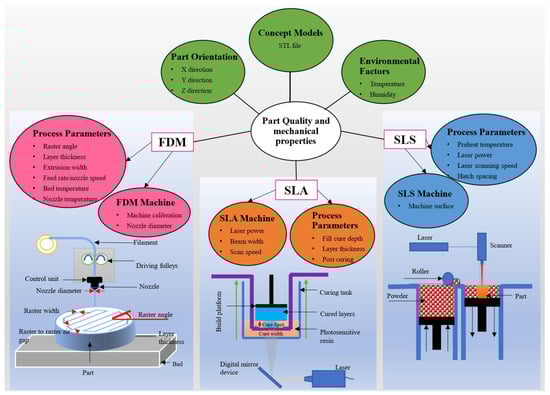 The printing parameters required for FDM, SLS, and SLA 3D printing are collectively summarized in Figure 3. The initial printing parameters such as quality of the .stl file, part orientation, and environmental factors are common printing process parameters in all three techniques. However, due to the variation in the structure formation technique, the printing process and a number of process parameters differ in each of these methods. The printing techniques can be chosen according to the requirement of the simplicity of printing, mechanical properties, printing time and layer resolution. For instance, SLA has the capability of printing high-resolution parts of up to 10 µm [33], while the minimum layer resolution of the SLS printed part is 20 µm [123] and the FDM only has the capability of printing high-resolution parts of up to 40 µm [124]. The value for the print resolution should be considered as a comparative guide only because the exponential growth of the 3D printing industry is continuously offering optimized versions of the 3D printers. The print resolution of some common commercially available 3D printers is listed in Table 1. Based on the data provided by the manufacturer, the print resolution up to 25 µm [125], 50 µm [126], 1 µm [127] for FDM, SLS, and SLA, respectively, is also claimed. On the other hand, in terms of the process simplicity in printing, the FDM is the most suitable because the process is as simple as heating the filament polymer to a semi-solid state and depositing it directly on the print bed. SLS is a comparatively complicated process among others, it requires the movement of two systems: roller and laser light. A list of commercially available FDM, SLS, and SLA 3D printers along with their material and print specifications is summarized in Table 1. This table provides an overview for selecting the desired 3D printer on the basis of the required print volume, material, and print process. From Table 1, it is also evident that the FDM provides a wide range of materials for 3D printing while SLA provides a high print resolution. Further discussion based on the material and print part properties is presented in Section 3 and Section 4.