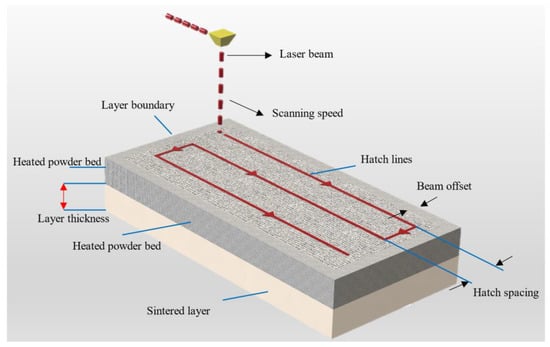 where ED is energy density, P is the laser power, d is laser beam diameter, v is scan velocity, and h is the hatch spacing. The hatch spacing, laser scanning speed, laser power, and preheat temperature are therefore determining process parameters responsible for the part properties of SLS printed objects [105,111,112], see Figure 4. Laser power is the input power set as the ratio of the total permissible power as per the requirement of a given material and layer thickness [113]. Laser scanning speed is the rate at which the laser beam is moved along the hatching or contour lines. It influences the maximum energy at a point of material and the total time required to complete a product [114]. Hatch spacing is also known as scan spacing is the distance between two consecutive laser beams. Preheating temperature is another important parameter that affects the part property in SLS. A powder that is not preheated requires a higher-power laser beam source to melt. Furthermore, higher preheating also reduces the temperature gradient between the sintered and un-sintered parts—contributing to the elimination of thermal stress and avoiding distortion [115].