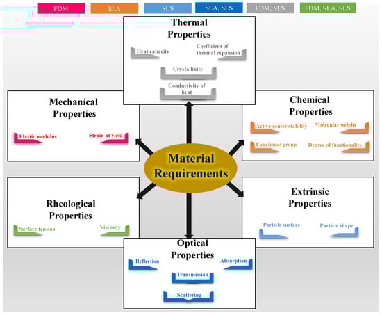 A pictographic summary of the various properties of print materials demanded for successful printability via FDM, SLS, and SLA 3D printing.