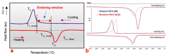 In SLS, the requirement of the laser energy intensity also depends on the temperature of the powder. The polymer powders are heated to a temperature close to the melting temperature for semi-crystalline powders and up to glass transition temperature for amorphous powders to lower the required laser energy and reduce the temperature gradient which also decreases the non-uniform shrinkage in the printed parts [174,175]. The preheating temperature should be close to melting temperature but should not be greater than the onset melting temperature to avoid premature melting of the powders. For general polymer materials, a preheating temperature 5–10 °C lower than the glass transition temperature is suggested [115]. Thus, the processing temperature must be precisely controlled between onset melting and onset crystallization temperature, and this metastable thermodynamic region is called the sintering window (Figure 6a) [176]. The sintering window can be characterized using a differential scanning calorimeter at a fixed heating and cooling rate, for example, 10 °C/min [168]. The sintering window, however, depends on the polymer being used. A wider sintering window is usually preferred in SLS. Figure 6b shows the thermo-analytical results (DSC measurement) of a commercial injection moulding PA12 grade in comparison with a commercial PA12 for SLS processing [168,177]. The stretch in the sintering window of SLS powders (red curves) can clearly be marked [168].