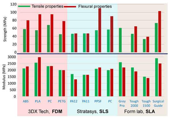 A graphical overview of the mechanical properties of 3D printed parts for a few commercially available materials, data are taken from the respective datasheet available on the supplier’s website. Tensile (green coloured) and flexural (red coloured) properties are plotted, the upper graph is strength, and the lower graph is the modulus of corresponding properties of FDM and SLS and SLA printed parts.