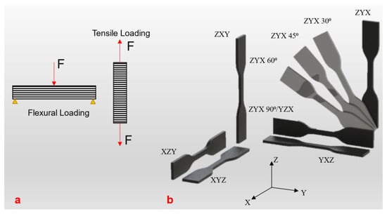 (a) Illustration of flexural and tensile loading and (b) definition of specimen orientation, redrawn from [16].