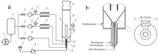 (a) Flow chart of the experiment apparatus, (b) Atomizer and spout gas inlet. 1. Root blower, 2. Buffer tank, 3. Pilot valve, 4. Rotameter, 5. Temperature controller, 6. Preheater, 7. Storage tank, 8. Peristaltic pump, 9. Annular jet nozzle, 10. Spouted inlet, 11. Distribution plate, 12. Heater band, 13. Draft tube, 14. Spout-fluid bed, 15. Bag-type dust remover.