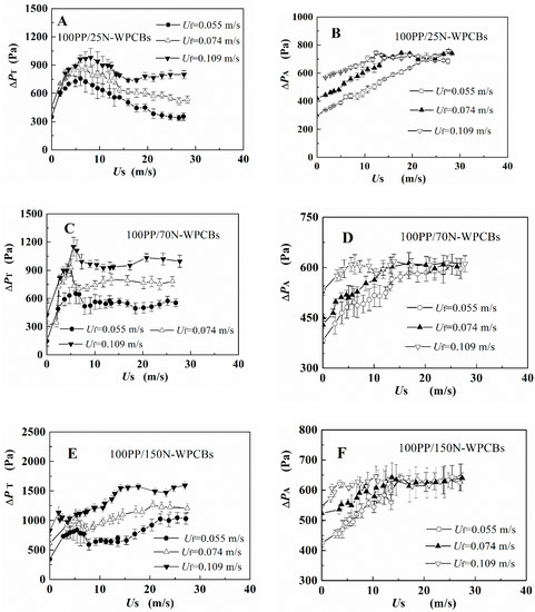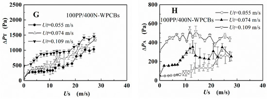 For particle mixtures 100PP/25N-WPCBs, 100PP/70N-WPCBs, and 100PP/150N-WPCBs, the pressure drops ΔPT and ΔPA initially increased to a maximum value as the spouting gas velocity increased in the condition of adding fluidizing gas in the annular area. When the spouting gas velocity continued to increase, all the pressure drops stabilized for the 100PP/25N-WPCB and 100PP/70N-WPCB particle mixtures. However, ΔPT displayed slight increases for the 100PP/150N-WPCB mixture. Combined with each test experiment phenomena, a large number of particles spouted from the draft tube at a high spouting gas velocity. The particle mixtures stopped spouting when the total pressure drop ΔPT reached the maximum value with the decrease of the spouting gas. For the 100PP/400N-WPCB particle mixture, the total pressure drop ΔPT had an increasing trend over the whole range of spouting gas velocities. Meanwhile, some channeling and dead zone could be observed in the bed. These undesirable fluidization phenomena did not disappear even with the increase of gas velocity.