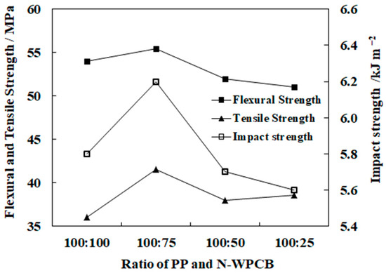 During fluidization coating, the PP particles were used to assist the fluidization medium, which improved the fluidization quality [20]. The effects of the PP content of the mixed particles on the mechanical properties are shown in Figure 4. The flexural strength, tensile strength, and impact strength of the composites first increased and then decreased with increasing mass ratio of PP to N-WPCBs, and the best mass ratio was 100:75.
