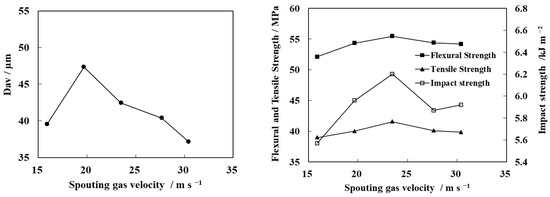 The spouting gas is the key factor for the fluidization of N-WPCB particles in the bed. It can further affect the modification of N-WPCB-coated particles and the mechanical properties of PP/N-WPCB composites. The change in the modified N-WPCB particle size and mechanical properties of the PP/N-WPCB composite with spouting gas velocity is shown in Figure 5. The modified N-WPCB particle size and the mechanical properties of the composites first increase and then decrease with increasing spouting gas velocity. The optimal spouting gas velocity is 23.49 m·s−1.
