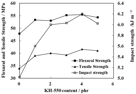 The effect of KH-550 content on the mechanical properties of PP/N-WPCB composites is shown in Figure 6. The mechanical properties of the composites are obviously improved by coating with KH-550. With the increasing dose of KH-550, the mechanical properties of the composites first increase, and then the flexural strength and impact strength show slightly downward trends. The optimum dose of KH-550 is 4 phr (phr, the ratio of KH-550 to N-WPCBs).