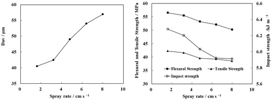 The spray rate has a direct effect on droplet size and uniformity [28]. Keeping the total amount of liquid constant, the effect of spray rate on the mechanical properties of PP/N-WPCB composites was studied. As shown in Figure 7, the modified particle size increased with the increasing of spray rate, while the mechanical properties of the composites decreased. This is because the droplet diameter increases with increasing spray rate when the solution is torn in the nozzle. The large droplet diameter leads to an increase in the probability of bonding between wet particles, accelerating the growth rate of modified particles. Eventually, the modified particle size is increased. However, the large spray rate more easily strengthened the growth of modified particles by agglomeration in the coating process, which reduced the uniformity of the modified particle coating [29]. Under this circumstance, the particle modification effect and the mechanical properties of the materials decreased. The low spray rate of the modifier solution can enhance the modification effect of particles in spout-fluid beds. However, the coating time was prolonged, resulting in an increase in energy consumption. When the spray rate increased from 1.6 cm·s−1 to 3.2 cm·s−1, the coating time was reduced by half. In addition, the bending, tensile, and impact strength of the material only decreased by 2.14%, 0.87%, and 1.81%, respectively. As the spray rate continued to increase to 4.8 cm·s−1, an agglomeration phenomenon appeared around the nozzles, while some particles adhered on the inner wall. This is because the wetting rate of the particle surface was much higher than that of the drying rate. Therefore, the best spray rate was 3.2 cm·s−1 in the next step.