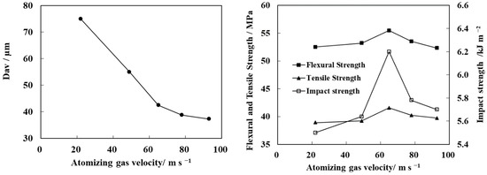 The atomization gas velocity is another key factor of the droplet size. The change in the modified N-WPCB particle size and mechanical properties of the PP/N-WPCB composite with atomization gas velocity is shown in Figure 8. At a low atomization gas velocity, the modified particle size decreases significantly with the increase of atomization gas velocity. When the atomization gas velocity exceeds 65.08 m·s−1, the rate of decrease of the modified particle size slows down. The bending strength, tensile strength, and impact strength of the composites first increase and then decrease with the increasing of atomization gas velocity. When the atomization gas velocity is 65.08 m·s−1, the mechanical properties of composites are the best.
