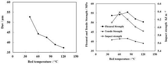 The modification of particles in the spout-fluid bed is closely related to the drying rate of the particle surface. Temperature is the factor controlling the drying rate. The changes in the modified particle size and mechanical properties of the PP/N-WPCB composite with bed temperature are shown in Figure 9. With an increasing bed temperature, the modified particle size decreases. The mechanical strength of the composites first increases and then decreases, and the optimal bed temperature is 80 °C.