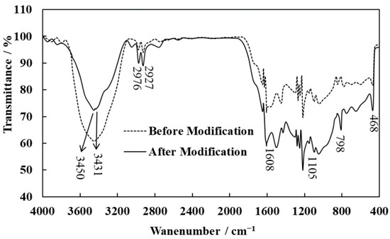 The FT-IR spectra of N-WPCB particles before and after modification are shown in Figure 11. The strong peak at 3456 cm−1 is associated with –OH stretching vibrations in either Si–OH groups or physically adsorbed water on the surface of the particles. The absorptions at 1105 cm−1, 798 cm−1, and 468 cm−1 are caused by asymmetric stretching vibrations, symmetric stretching vibrations, and flexural vibrations of Si–O–Si, respectively. The absorptions at 2964 cm−1 and 2927 cm−1 are caused by asymmetric stretching vibrations and symmetric stretching vibrations of –CH2, respectively. Specifically, for the N-WPCB modified particle, the modification of KH-550 is indicated by the new absorption peaks at 3398 cm−1 and 1608 cm−1, which are caused by the stretching vibrations and flexural vibrations of –NH2, respectively.