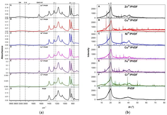 (a) FTIR spectra of solid state PVDF-doped/undoped material at room temperature. (b) XRD data for PVDF thin films (broad lines) and pure metal nitrate hydrates (sharp lines) at room temperature. A: Zn2+/PVDF. B: Cu2+/PVDF. C: Ni2+/PVDF. D: Co2+/PVDF. E: Fe3+/PVDF. F: Cr3+/PVDF. G: PVDF.