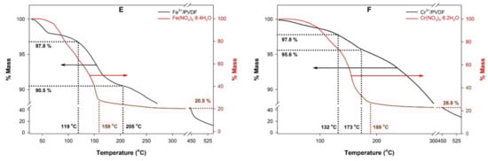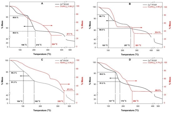 TGA of PVDF-doped materials (black line, left axis) and corresponding pure metal nitrate (dark red line, right axis). The stoichiometries shown for the metal nitrate hydrates were determined by the mass losses. (A) Zn2+/PVDF and Zn(NO3)2·5.8H2O. (B) Cu2+/PVDF and Cu(NO3)2·2.8H2O. (C) Ni2+/PVDF and Ni(NO3)2·5.3H2O. (D) Co2+/PVDF and Co(NO3)2·5.7H2O. (E) Fe3+/PVDF and Fe(NO3)3·8.4H2O. (F) Cr3+/PVDF and Cr(NO3)3·8.2H2O.