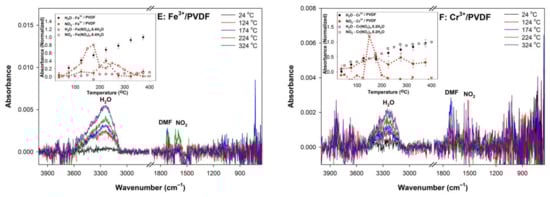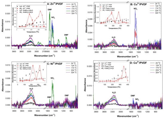 When the metal nitrate hydrates are doped into PVDF, the thermal decomposition of the dopants follow the same reactivity as the pure metal salts, but at different temperatures. Figure 3 shows the FTIR spectra of the gas phase thermal decomposition products of the PVDF doped materials. As with the pure metal salt hydrates, the primary emissions are NO2 and H2O as the temperature is increased. Peaks assigned to loss of DMF (1100, 1400, and 1710 cm−1) [36] are observed when PVDF is doped with Zn2+ (strong), Ni2+ (weak), and Cr3+ (weak). The insets in Figure 3 show a comparison of main volatile decomposition products of both PVDF-doped material and pure metal nitrates. The loss of H2O and NO2 becomes more significant at lower temperatures for the PVDF-doped samples compared to the pure metal nitrate hydrates. The evolution of NO2 maximizes at just below the onset temperature of the final oxide formation for the decomposition of the pure metal nitrate hydrates. This trend is also true for the PVDF doped materials, with the observation that for Zn2+, Cu2+, Ni2+, and Co2+, this maximum is at significantly lower temperature. The reverse is true for Fe3+ and Cr3+ doped PVDF. This implies that the PVDF host catalyzes the thermal decomposition of the nitrate ion for the 2+ ions but inhibits this reaction for the 3+ ions.
