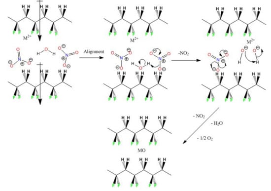 Scheme 1 shows a possible mechanism for the decomposition of the nitrate ion in the PVDF matrix to form the product oxide. The initially prepared room temperature samples show no crystallinity associated with the dopant metal salt, indicating that the dopant is a solute, dispersed throughout the PVDF matrix. This allows the ions, specifically the nitrate ions, to freely rotate about the C3 axis without any restrictions from neighboring ions. Thus, the nitrate ion can align with the local dipole moment and/or the permanent ferroelectric moment of the PVDF (it may be that the alignment of the PVDF into the β-phase is cooperative with the rotation of the nitrate ion). There is no shift in the C–H stretching peaks in the IR spectra, which implies (unsurprisingly) that there is no hydrogen-bonding between the C–H and the weak base NO3−, but the local electric field may polarize and weaken the N–O bond. Likewise, the partially negative O end of H2O can also align with the positive end of the PVDF dipole. In those cases, where the nitrate ion and water are near each other, the N–O bond can cleave heterolytically to form NO2 and O2−. If the oxide ion finds a metal ion, then an oxide can form. If the O2− encounters an H2O, then two OH− ions can form. At elevated temperature the OH− ions are mobile and can form M(OH)x crystallites. The other option is that the local dipolar field induces homolytic cleave of an N–O bond, then the products are NO2 and an O· radical, which combines with another O· to form O2. At higher temperatures, metal hydroxides can dehydrate to form metal oxide products.