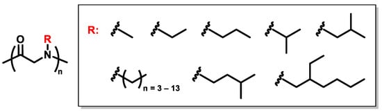 - Gangloff, N.; Ulbricht, J.; Lorson, T.; Schlaad, H.; Luxenhofer, R. Peptoids and Polypeptoids at the Frontier of Supra- and Macromolecular Engineering. Chem. Rev. 2016, 116, 1753–1802. [Google Scholar] [CrossRef] [PubMed]