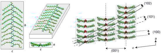 Polypeptoids bearing linear aliphatic N-substituents shorter than 2 carbons are amorphous and behave as random coil-like polymers. The most famous example is poly (N-methyl glycine) (PNMG), a.k.a. polysarcosine, the simplest member of the polypeptoid family, which is amorphous and can be readily dissolved in water or alcohol [,,]. As a promising biodegradable poly (ethylene glycol) (PEG)-alternative, PNMG can be served as hydrophilic component by providing steric stabilization of nanostructures, plasmonic particles or proteins for various biomedical applications, such as drug delivery and theranostics [,,,,,,]. On the other hand, it has been found that polypeptoids with relatively long linear n-alkyl side chains (4 ≤ S ≤ 14, where S is the number of carbon atoms in the n-alkyl group) are highly crystalline in the solid state [,,]. Using X-ray diffraction and molecular dynamics simulations, Balsara, Zuckermann and coworkers have revealed their general packing motif: Polypeptoid molecules bearing n-alkyl side chains tend to adopt a board-like structure in the crystalline state, where the backbone is fully extended in an all-cis backbone conformation and is approximately coplanar with the n-alkyl side chains (Figure 2) []. The all cis-amide backbone conformation, which is more compact and possesses a higher degree of ordering than the all-trans backbone conformation, allows for more favorable intra- and inter-molecular interactions upon crystallization/supramolecular assembly. With N backbone repeating units and S number of carbons on the n-alkyl side chains, the unit cell dimensions, namely a, b and c, follow a universal relationship, in which a = 0.455 nm, b = (0.298N + 0.035) nm and c = (0.186S + 0.55) nm. Note that crystallization of these board-like polypeptoids can occur at relatively low number-average degree of polymerization (e.g., DPn = 9) in both solid and solution states [,].