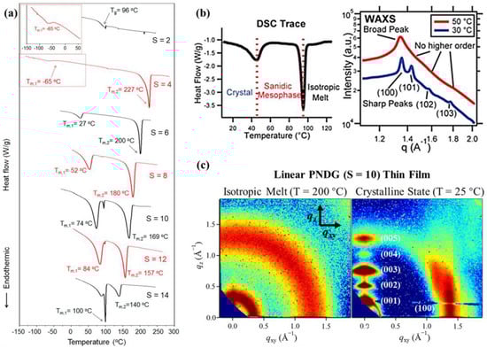 By using differential scanning calorimetry (DSC), Luxenhofer showed that the glass transition temperature (Tg) of polypeptoids with 1 ≤ S ≤ 5 decreases with increasing n-alkyl side chain length [], which is likely due to the plasticization effect induced by the flexible n-alkyl side chains []. The increase of n-alkyl side chain length also leads to an increasing tendency towards crystallization. Lee et al. found that both linear and cyclic polypeptoids bearing long linear n-alkyl side chains (4 ≤ S ≤ 14) exhibit two phase transitions upon temperature increase (Figure 3a) []. These two transition temperatures are strongly coupled and highly depend on the number of carbon atoms in the n-alkyl group. Using temperature-dependent X-ray scattering, Balsara, Zuckermann and coworkers further evidenced the broadening of the (100) peak and the disappearance of higher order peaks of diblock polypeptoid bearing n-decyl side chains during the lower-temperature transition, indicating the diminished ordering for the face-to-face stacking of the board-like polypeptoid molecules (Figure 3b) []. Thus, it has been suggested that the lower-temperature transition corresponds to a crystalline phase to a “sanidic” liquid crystalline (LC) mesophase transition, while the higher-temperature transition corresponds to the LC mesophase to isotropic melt transition (Figure 3b) []. In our very recent study on poly (N-decyl glycine) (PNDG) thin films prepared on solid substrates, we showed that both linear and cyclic PNDG exhibit two amorphous halos when heating above the isotropic melt transition temperature (Figure 3c) []. Interestingly, the d-spacings of these two amorphous halos are in good agreement with the theoretical molecular dimension of PNDG in an extended trans-amide backbone conformation. Therefore, it was proposed that polypeptoid molecules undergo a cis-to-trans amide backbone conformational transition when heating above the isotropic melting temperature, where the long n-alkyl side chains are still nearly coplanar with the polypeptoid backbone [].