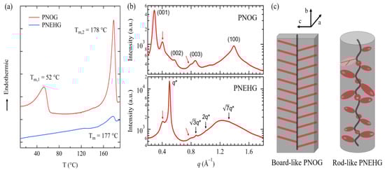 (a) DSC thermograms of PNOG (DPn = 103) and PNEHG (DPn = 100) homopolymers during the second heating cycle. (b) One-dimensional WAXD profiles of the PNOG and PNEHG homopolymers measured at T = 45 °C. The primary and secondary peaks associated to the Kapton windows on the sample cell are indicated by the red arrows. (c) Proposed molecular geometries of PNOG and PNEHG at crystalline/liquid-crystalline state. Figure reproduced from reference [] with permission from the American Chemical Society.