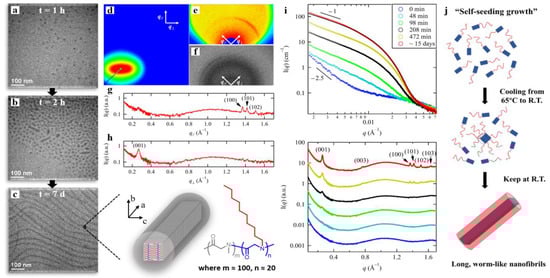 (a–c) Representative cryo-TEM images of 1 mg/mL PNMG112-b-PNDG16 methanol solution at different waiting time (t) after been cooled down to room temperature. The chemical structure of PNMG-b-PNDG block copolypeptoid and the schematic illustration of molecular packings of the core-forming PNDG blocks within a nanofibril are shown in the inset of (c), where the backbones and n-decyl side chains of PNDG are indicated in blue and red, respectively. (d–f) Two-dimensional SAXS (d), MAXS (e) and WAXS (f) images for 5 mg/mL PNMG105-b-PNDG20 methanol solution measured during unidirectional flow at room temperature. The directions parallel (q//) and perpendicular (q⊥) to the flow direction are indicated by arrows. The corresponding one-dimensional profiles of the MAXS/WAXS results along the q// and q⊥ directions are plotted in (g) and (h), respectively. (i) SAXS (top) and MAXS/WAXS (bottom) profiles of 5 mg/mL PNMG105-b-PNDG20 methanol solution measured at static state at different t. The solid line in the SAXS profile at t = ~15 days corresponds to the best-fit to the data based on the cylindrical-shaped micelle model. (j) Schematic illustration of the proposed self-assembly mechanisms for the 1D nanofibrils (e.g., PNMG105-b-PNDG20) via CDSA. Figures reproduced from references [,] with permission from the American Chemical Society.